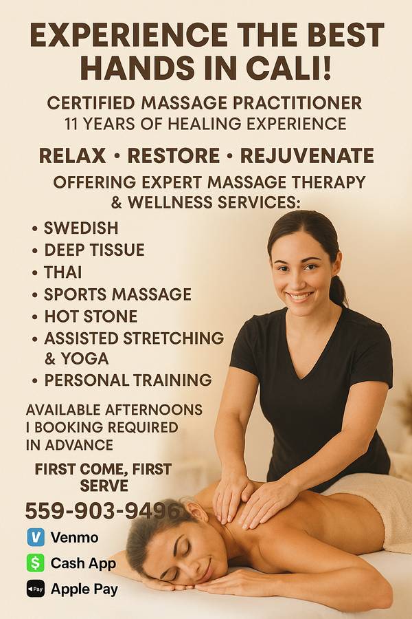 Hi I offer the most relaxing professional and trained massages around , experience is a huge factor in my expertise, knowledge, techniques, my massage table is extra wide for more comfort and weight capacity is up to 500lbs. I’m able to assist getting on and off table if needed !! Elderly and handicap is welcome all are welcome. Available after 3pm. Deposit is required! No exception . Good hygiene is very appreciated and gratuity is very appreciated as well. I offer massages of different styles and tend to each client uniquely of what my intuitive instincts tell me.. with that said your best care is my goals.